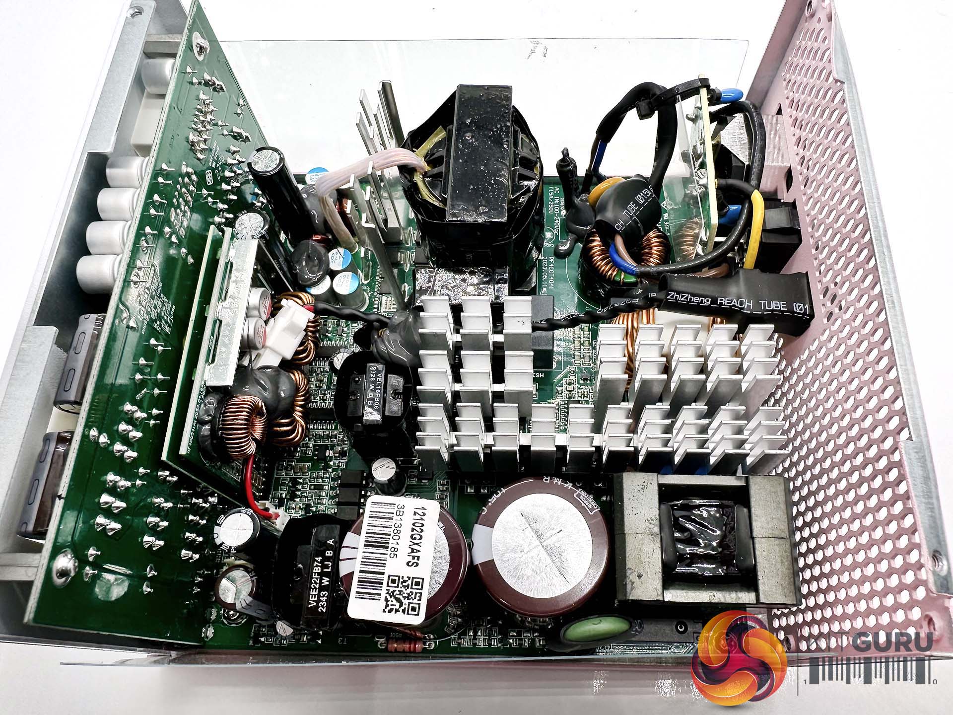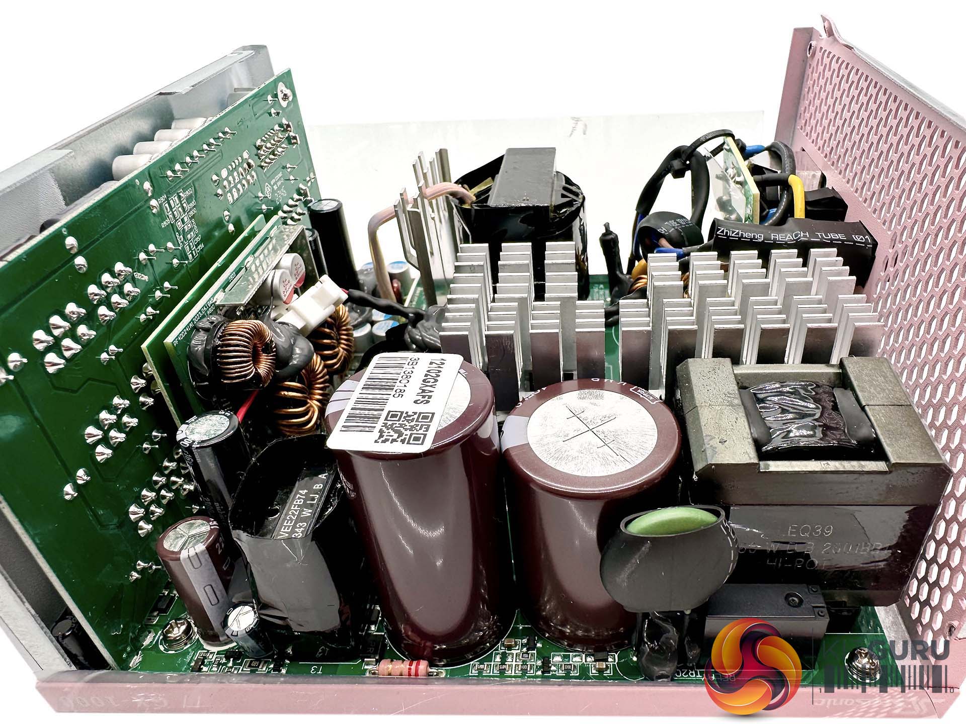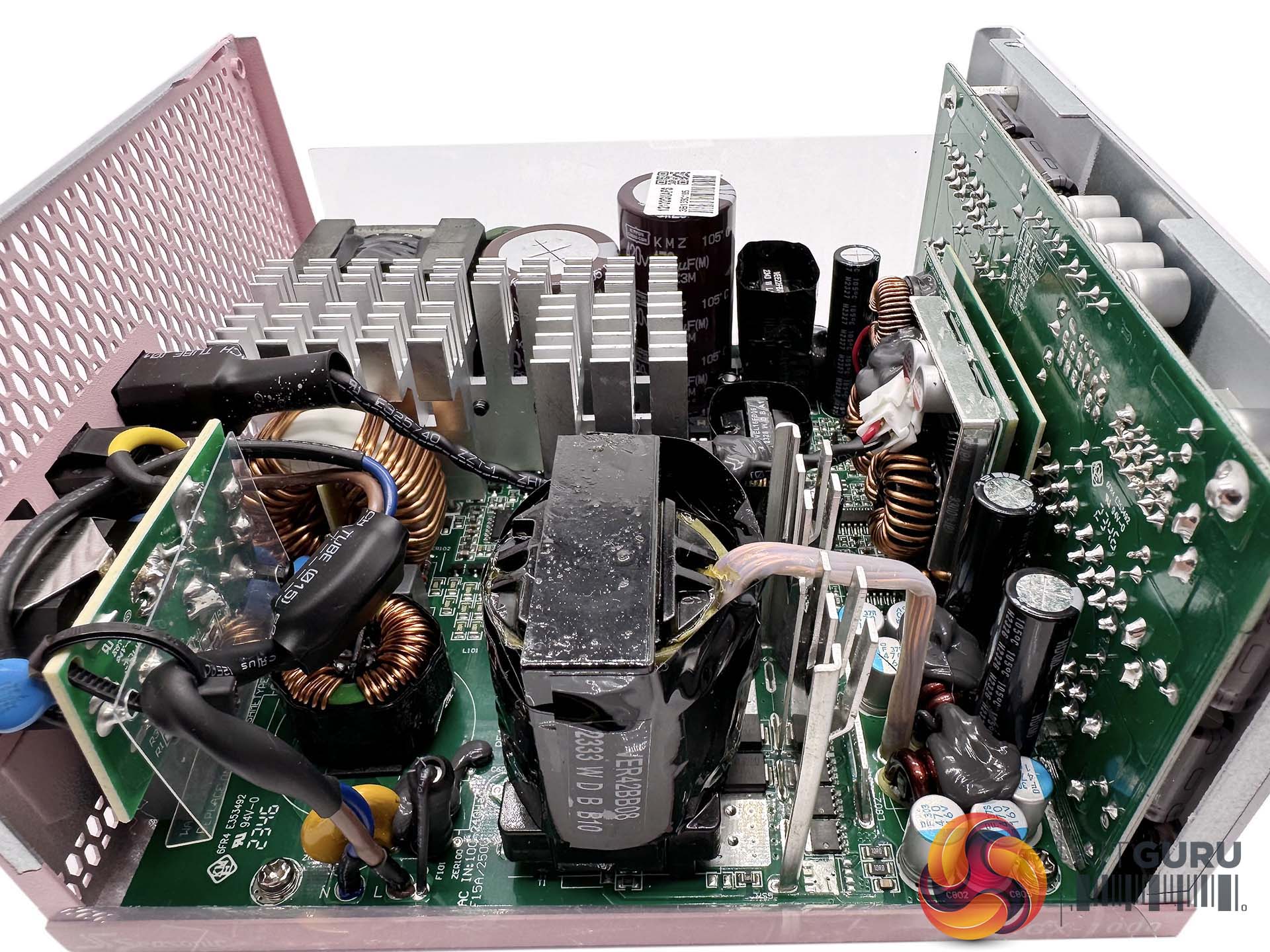 This is a fairly compact platform and as we would expect from Seasonic, its very well put together. There are a handful of large heatsinks and there appears to be adequate cooling for the 12V FETs. A full bridge topology is adopted for this design, along with an LLC resonant converter. A pair of VRMs generate the minor rails with eight FETs. The primary capacitors are high grade Japanese 105C rated KMR from Nippon Chemi Con – one is rated 420V 470uF and the other is 420V 390uF, for a total of 860uF.