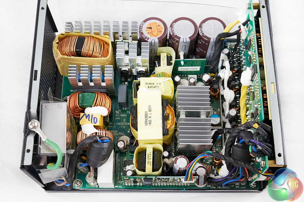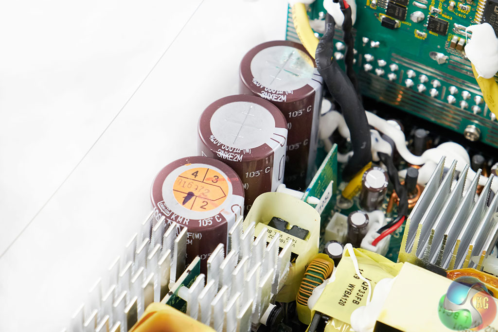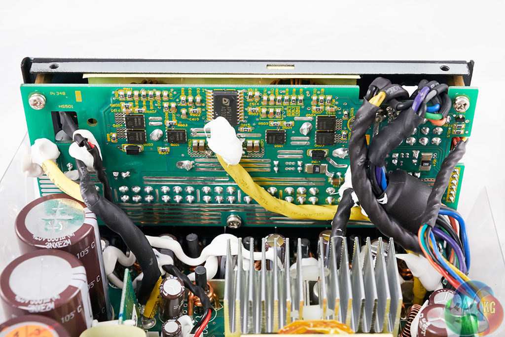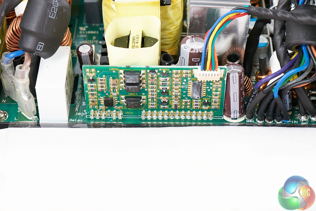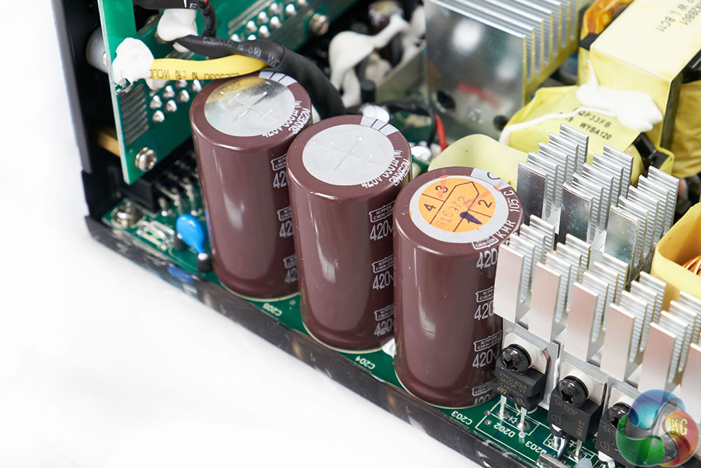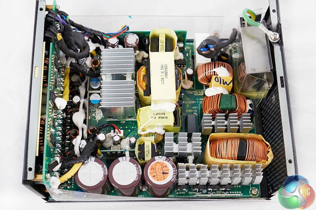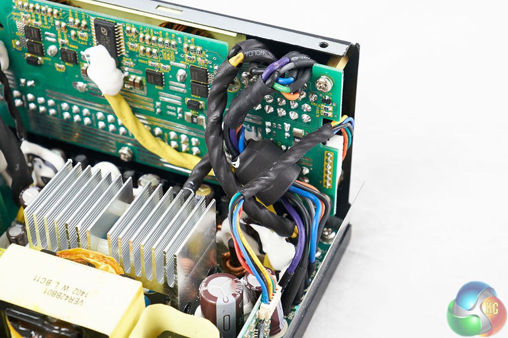 The Seasonic DC to DC convertor design is very clean with several rows of heatsinks separating the components. These may seem small, but with 80 Plus Gold Efficiency and the large overhead fan, there should be no ambient temperature problems.