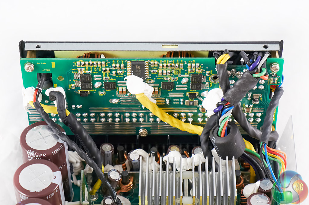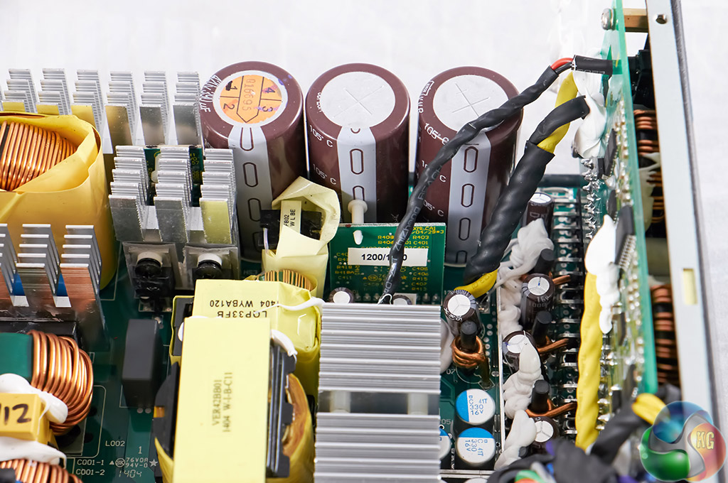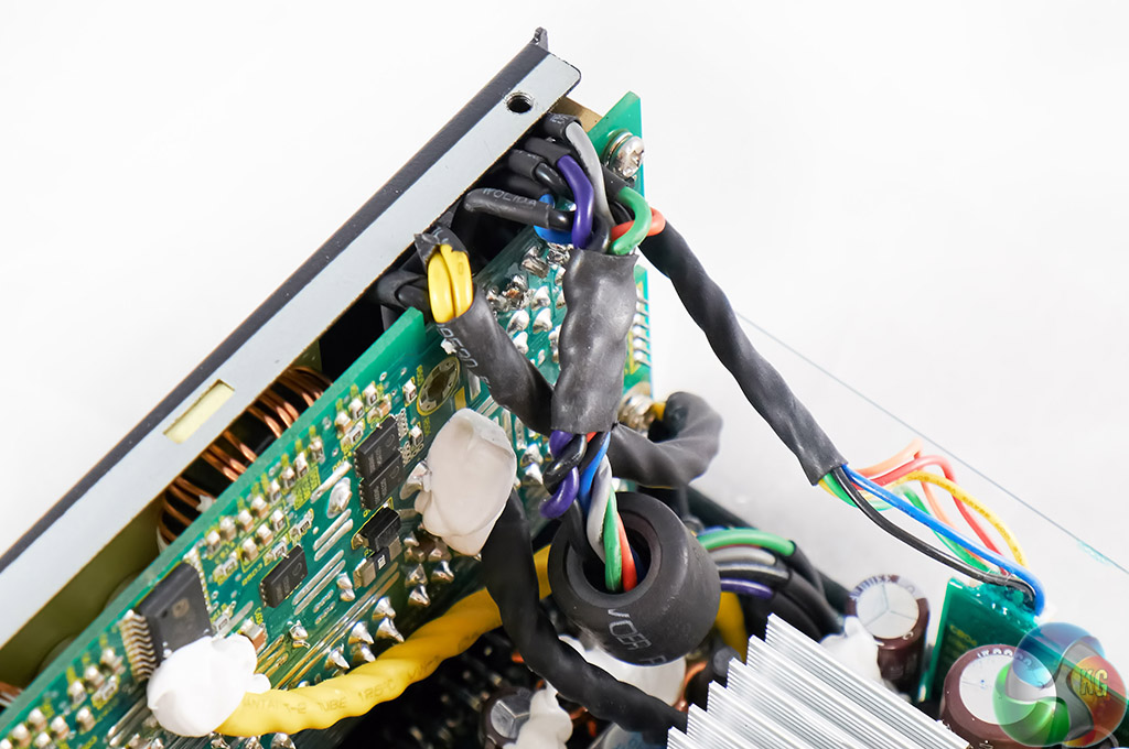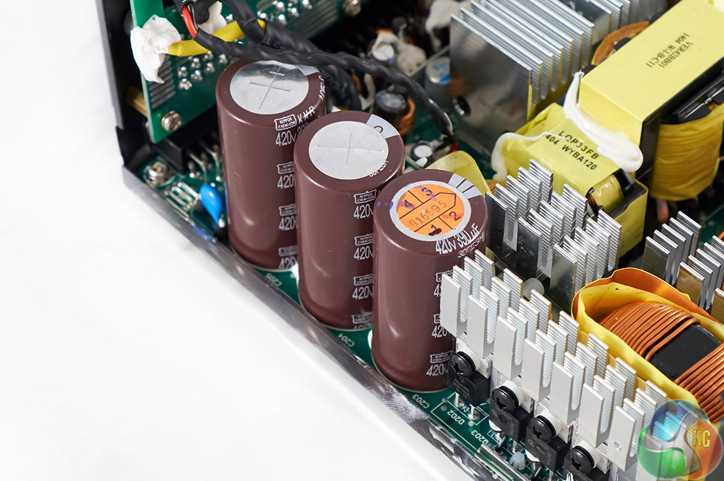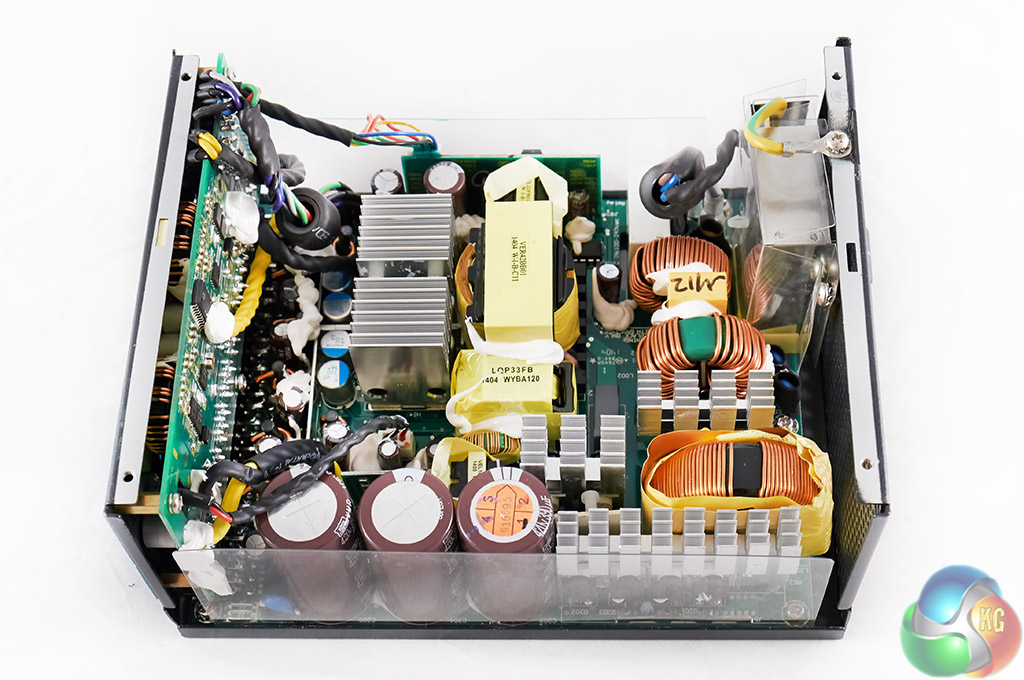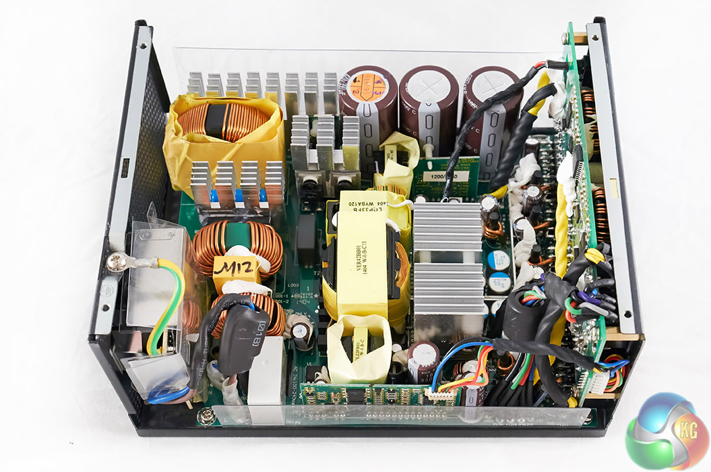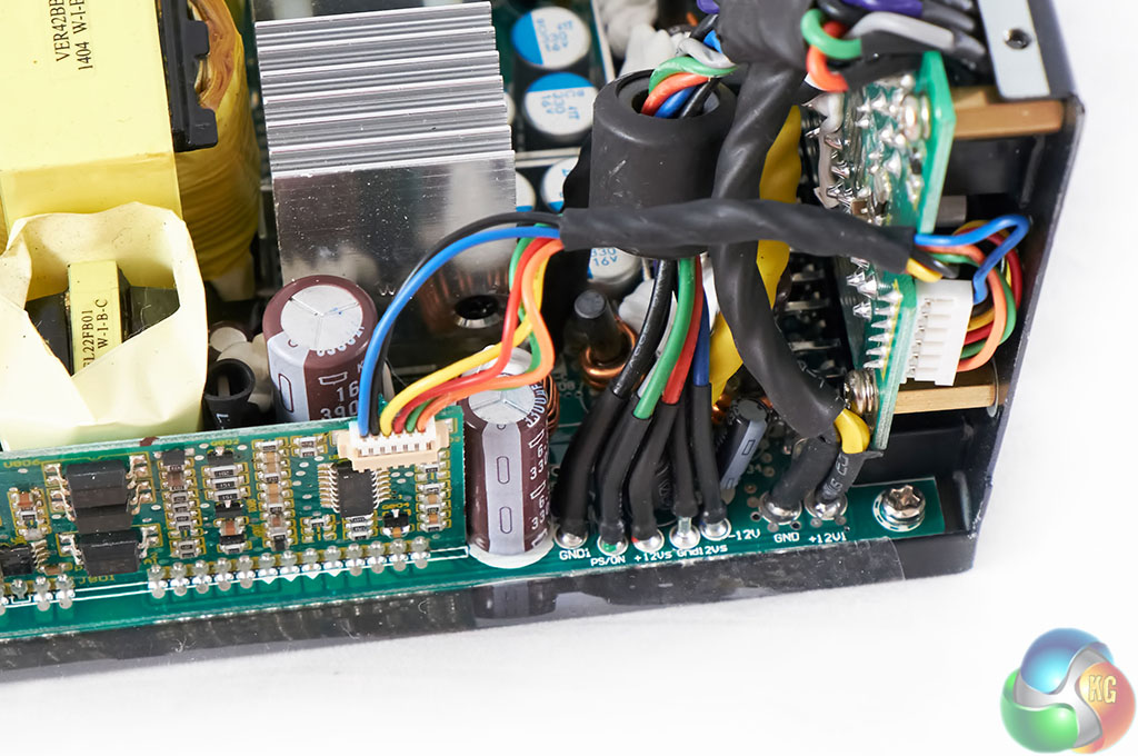 The Seasonic DC to DC convertor design is very clean with several rows of heatsinks separating the components. These may seem small, but with 80 Plus Gold Efficiency and the large overhead fan, there should be no ambient temperature problems.