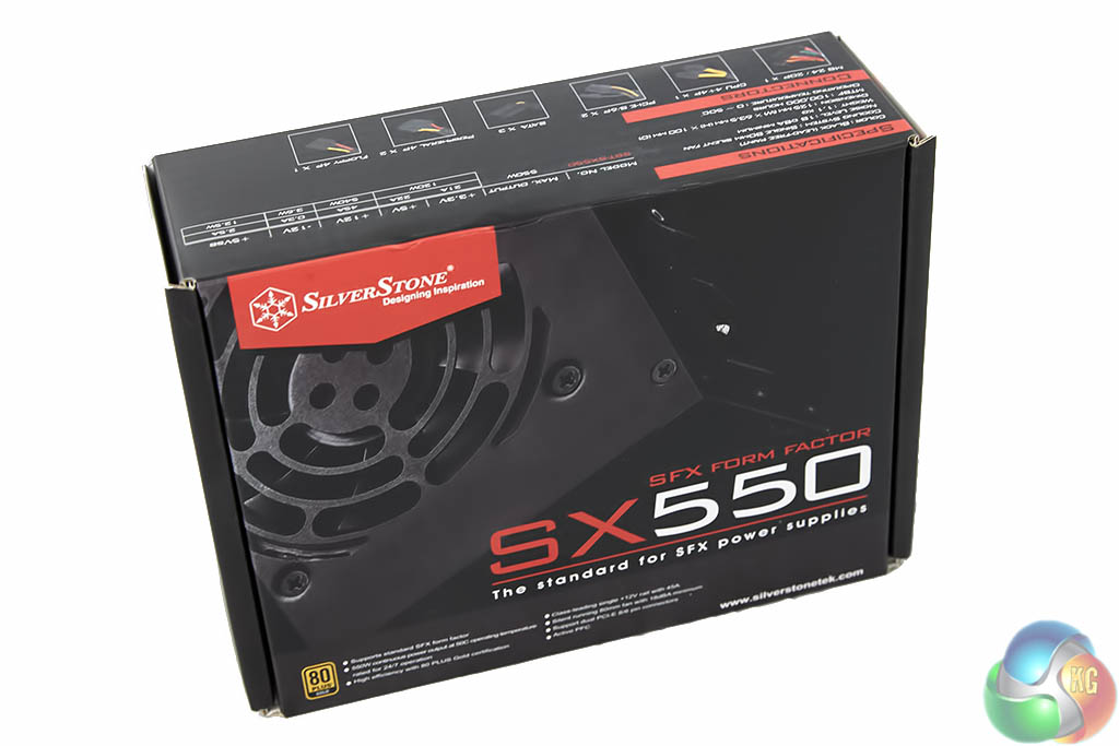 The SilverStone SST-SX550 box artwork shows a close up of the fan grill, at an angle. The product name is clearly listed bottom right at the front of the box.
