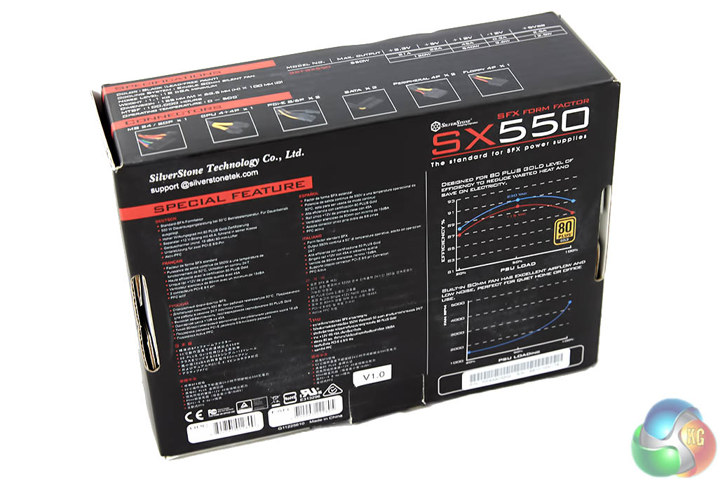 The rear of the box lists some technical data including PSU load and fan speeds under load. SilverStone are clearly focusing on noise levels, given the diagrams on the box.