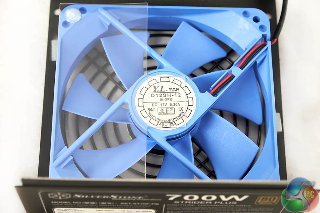 The Silverstone Strider Plus 700W is using a 120mm 7 blade Yate Loon fan (D12SH-12). The speed is rated at a maximum of 2,200 rpm with an airflow of 88cfm and a maximum noise rating of 40dBa. This is a standard quality ball bearing fan.