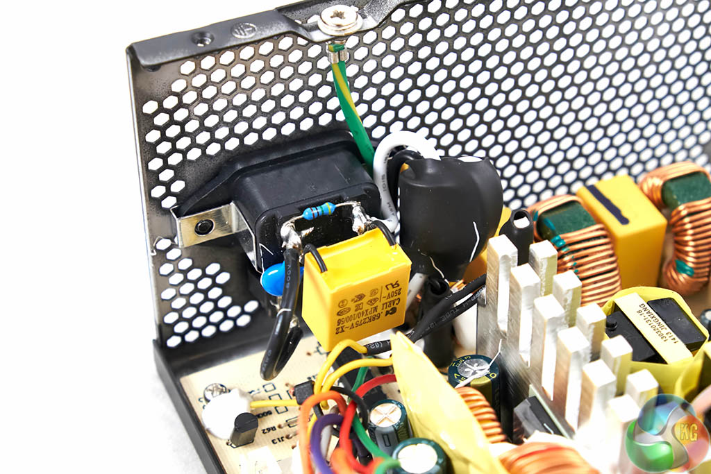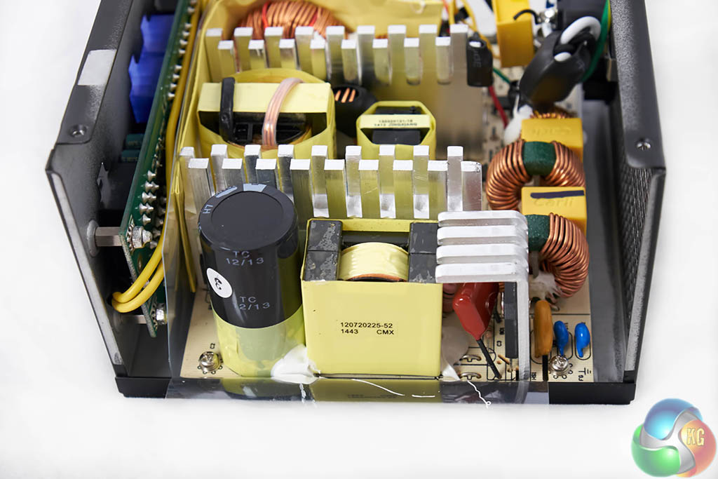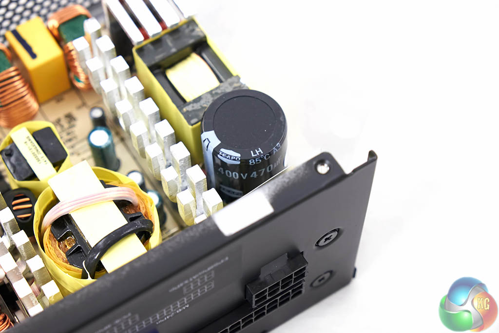 We can tell this is a budget oriented power supply by some of the design considerations. It is slightly disappointing to see a Chinese TEAPO 85c capacitor used in the primary stage (rated 400V 470uF). A lot of secondary capacitors are also 85c Chinese branded which always raises a little flag for me concerning long term durability.