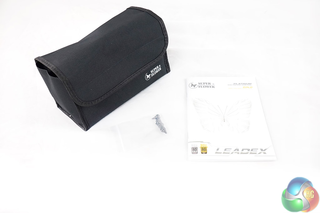 The power supply is protected between two blocks of thick foam. A user manual rests on top. The cables and other accessories are stored in a resealable bag, shown above. Mounting screws are also included.