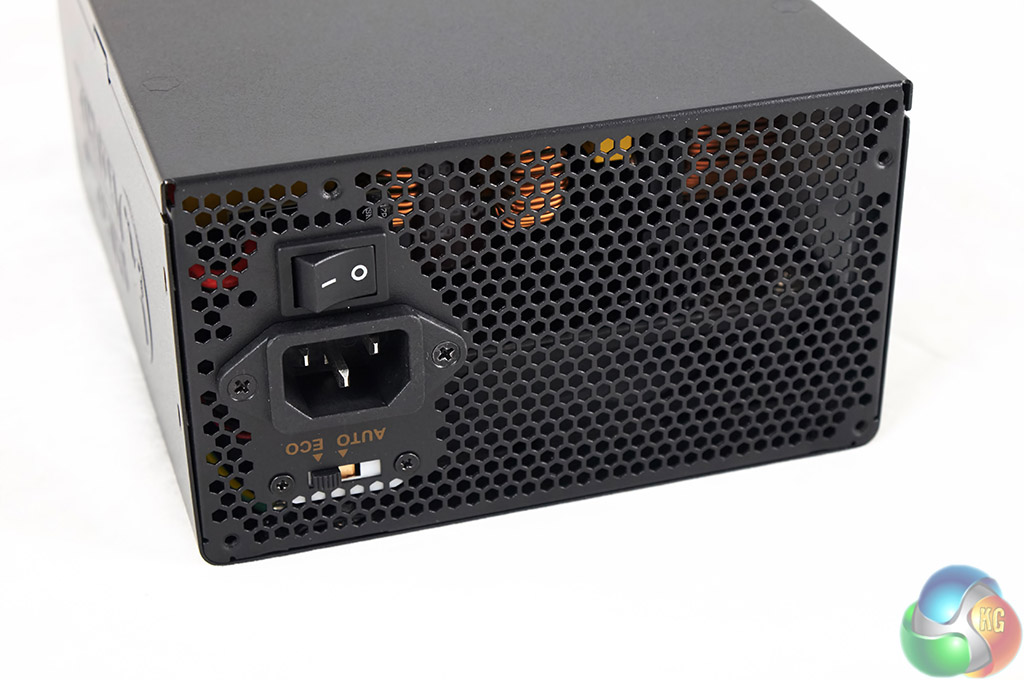 One side of the chassis is vented with a power connector and switch at the side. There is an ‘AUTO' and ‘ECO' switch underneath which offers fan control adjustment. ECO mode activates a semi passive mode to allow the fan to stay slow until a specific temperature is hit.