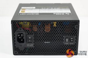 One side of the power supply is fully vented with a power cable and switch on one side. The other side of this panel features two small switches. One is for ECO on/off and LED on/off (for the modular cable connector headers on the reverse side).