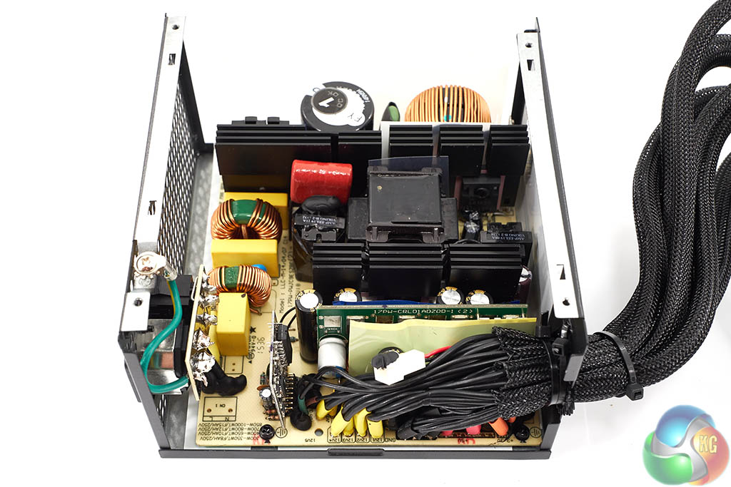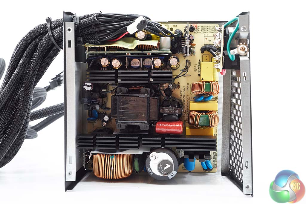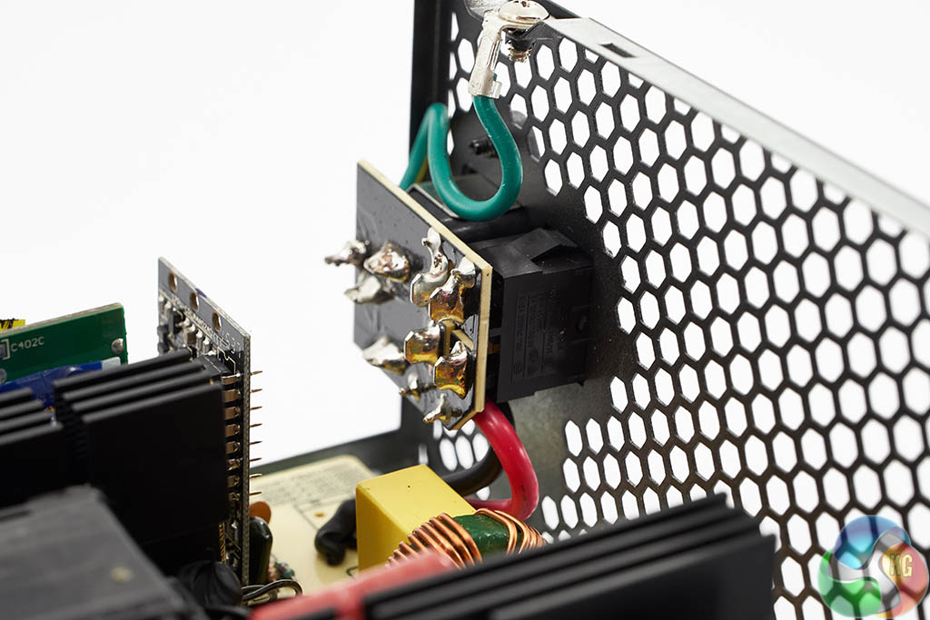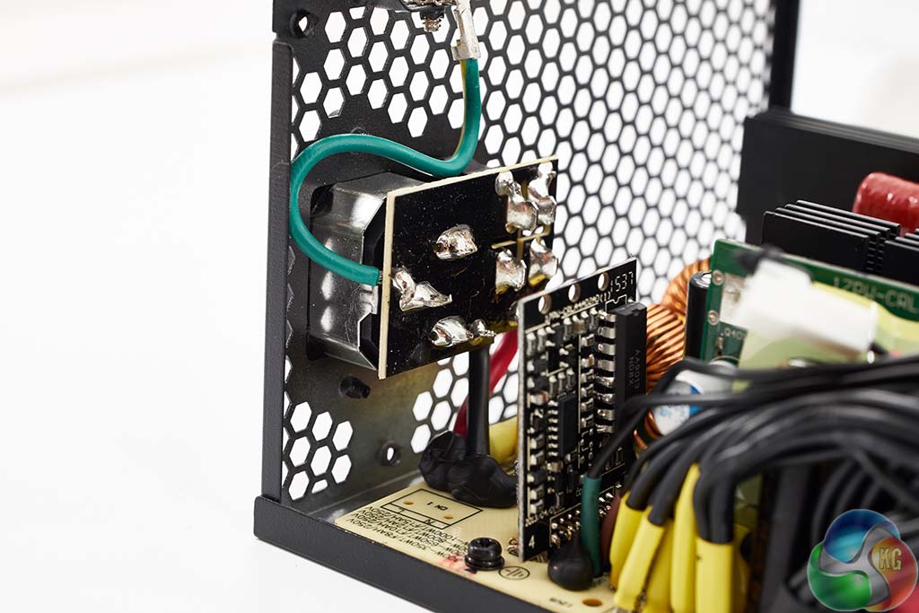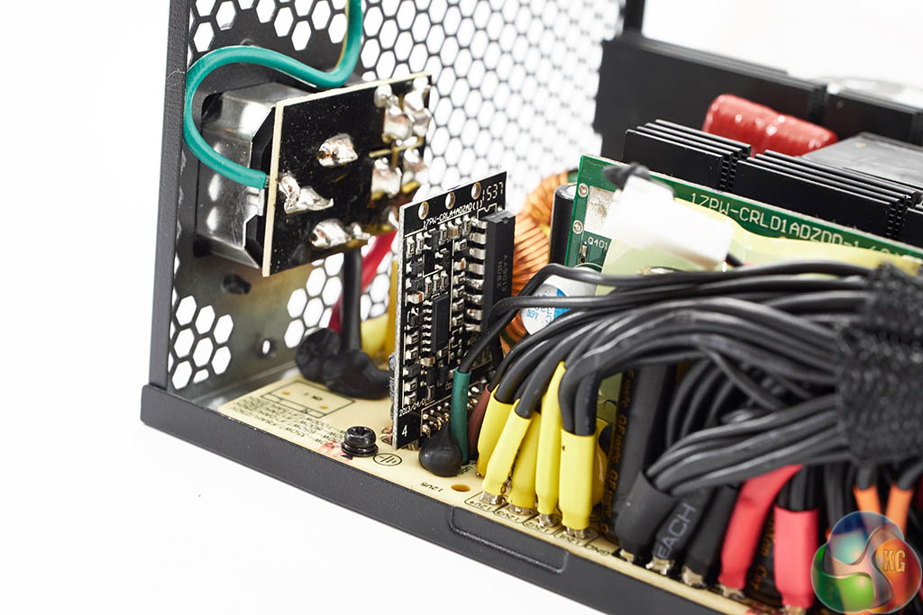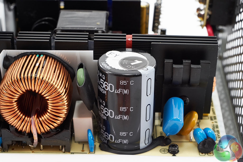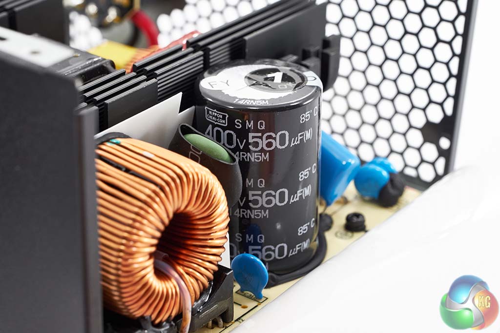 The Super Flower design is quite clean although I did notice some less than stellar PCB soldering, including some hand made solder joints. The primary capacitor is Japanese branded Nippon Chemi Con (SMQ series) – rated 400v 560uF. It is one of the lower 85c rated caps however, not 105c. Secondary stage capacitors are also 85c rated.