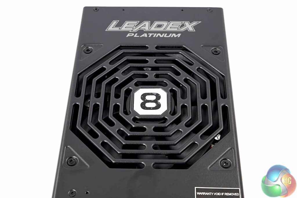 The large fan is hidden behind a thick grill system – this is cut into the chassis itself. The Super Flower logo in the center has been replaced with an ‘8 Pack' logo.