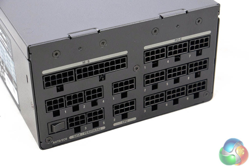 There are plenty of connectors on the modular bay panel on the other end of the chassis. Each section of the modular bay area is labelled to explain which cables to use. There is a AUTO/ECO button in the corner as well to reduce fan noise.