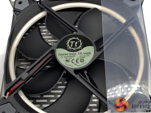 Thermaltake are using an ‘ultra quiet Hydraulic Bearing fan'. Its 140mm with the model number ‘TT-1425' on the sticker. You can actually buy these fans for £4.99 (HERE). Maximum Air flow is rated 1000 rpm – rated 12V 0.30A.