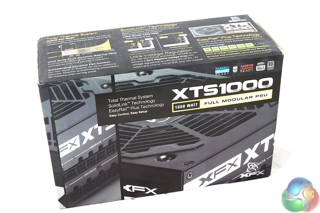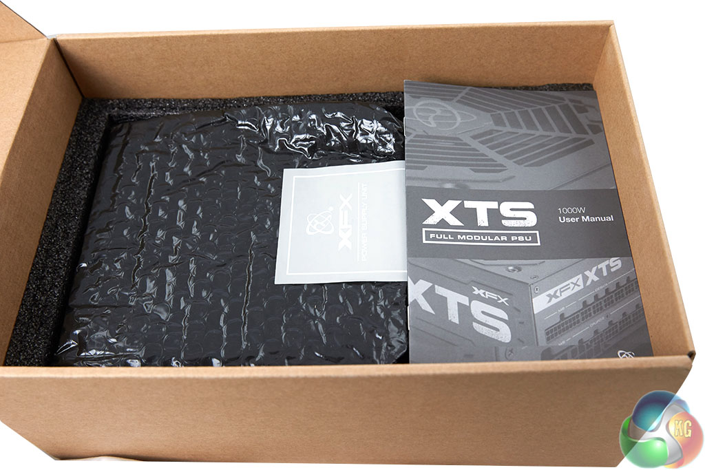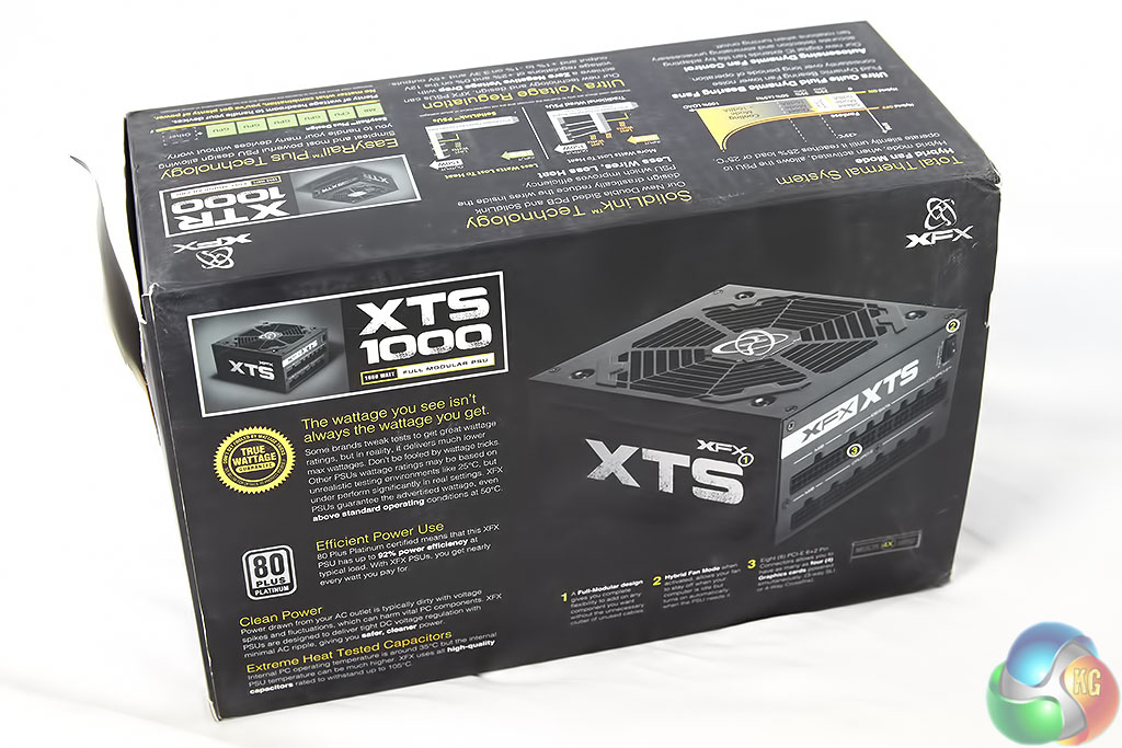 The XFX XTS 1000 box artwork is rather cluttered, but there is a nice quality image of the unit itself visible on the front of the box. The PR agency handling the shipment of this item decided to wrap the power supply in a thin plastic bag with no protection – the outer box was (unsurprisingly) completely destroyed by the time it reached us, but we managed to get another box for the purposes of the pictures in this review today. Luckily the unit itself inside was undamaged.
