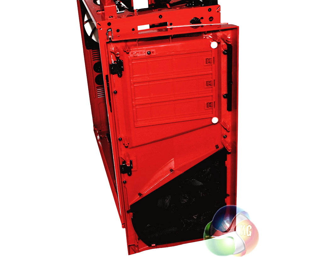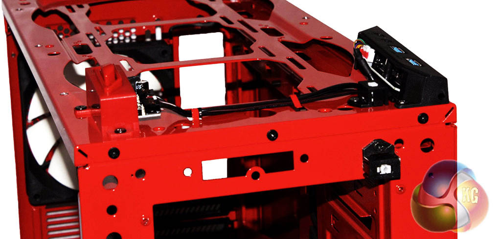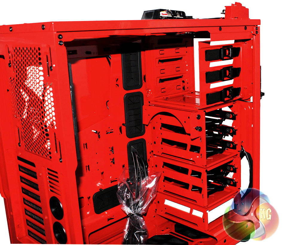 The insides of the case are all red, with black covers and mounts adding to the aesthetic appeal. At the rear is another white fan with a black shroud. There is a 140mm fan installed, exhausting warm air outside the chassis. The mount can also take a 120mm fan.