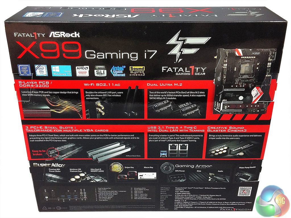 The ASRock Fatal1ty X99 Gaming i7 comes well packaged in a double-box with a padded anti-static bag. The packaging highlights the Gaming branding of the motherboard, though much of the feature focus is on connectivity (dual M.2, USB 3.1 and dual LAN) and build quality (steel reinforced PCIe slots, 8 layer PCB) rather than Gamer-centric features.