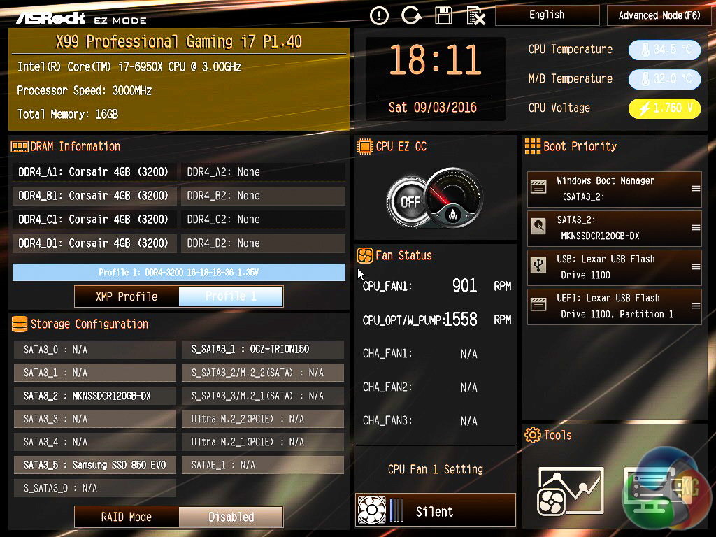 Upon entering the UEFI users are greeted by a splashscreen called EZ Mode; ASUS uses similar terminology for its splashscreen too. The general logic is that less-confident UEFI users should be able to access the most common options here such as boot order and XMP.