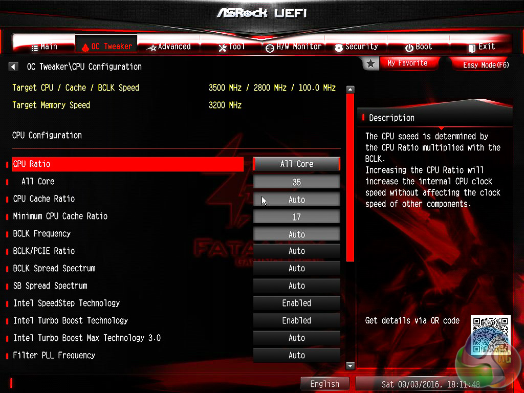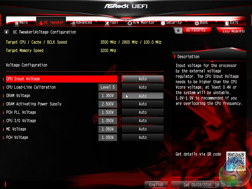 CPU tweaking options include the cache, Turbo Boost options and core ratios. By default, when enabling XMP or multicore enhancement, ASRock keeps to a 3.5GHz all-core turbo with up to 4GHz on the single golden core as dictated by Intel's new Turbo Boost 3.0 behaviour.