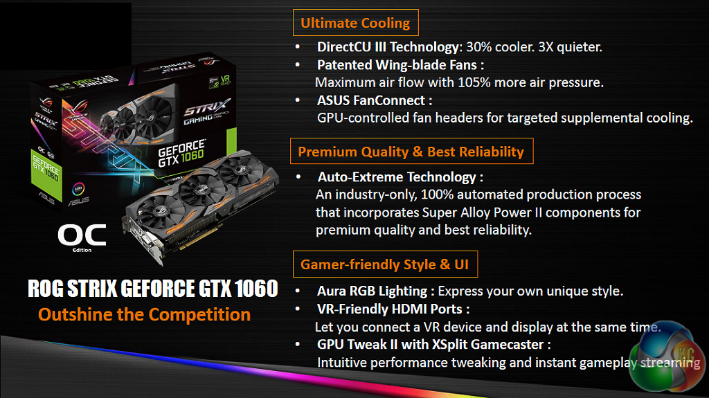 Nvidia's GTX 1060 is now available to buy and while the reference design (Founders Edition) is an interesting choice, it's the customised variants from Nvidia partners that should offer the best cooling, performance and feature set. The ASUS GTX 1060 STRIX is the first of the custom GTX 1060s to be tested by KitGuru so let's see what it has to offer.