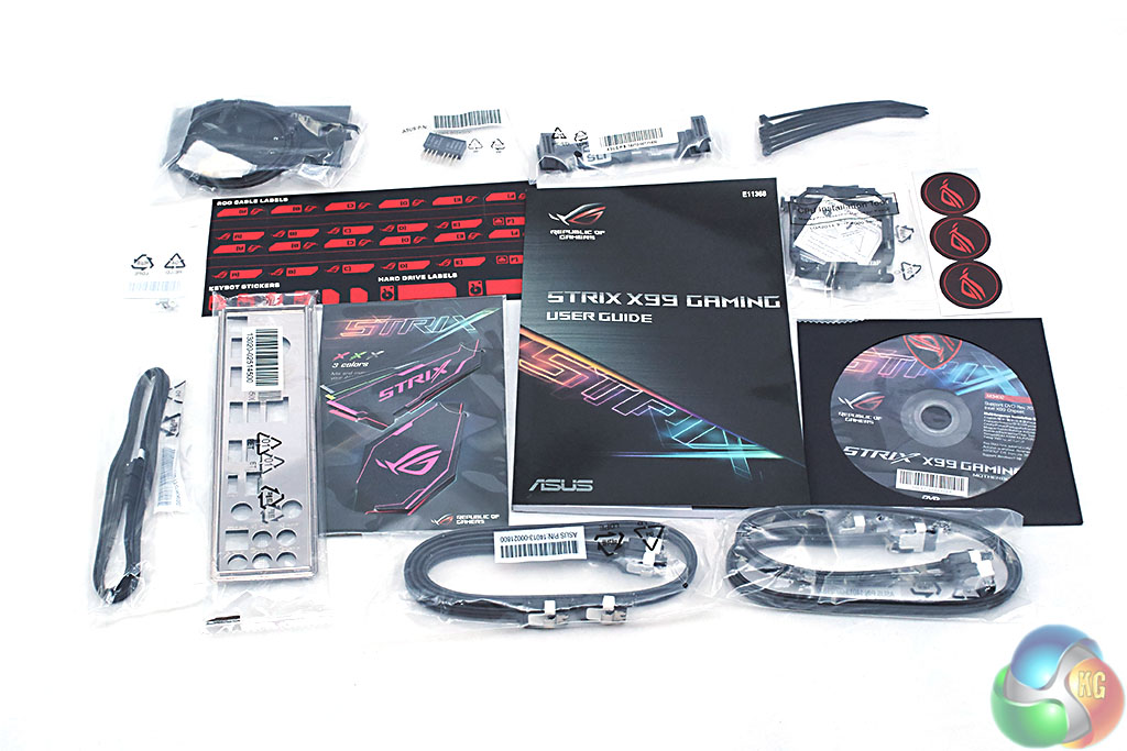 Packaging for the ROG STRIX X99 Gaming fully exploits the Republic of Gamers branding and colour scheme, something that has become synonymous with innovation and performance in the enthusiast market. The illustration of STRIX in a multi-coloured LED-style format alludes to the RGB feature of this motherboard.