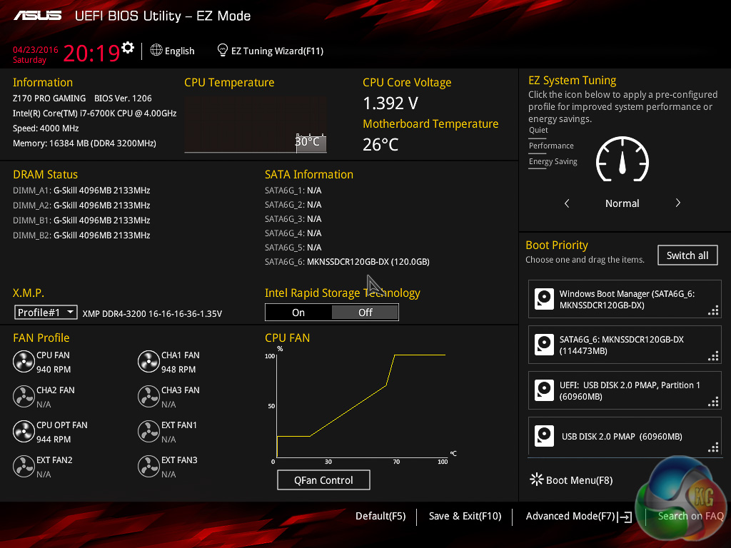 Similar to other vendors the ASUS UEFI launches into its “EZ Mode” which has a simplified dashboard containing the most common settings and information basic users would be likely to use. These things include enabling of an XMP profile, Intel Rapid Storage, the automated System Tuning utility, changing the boot order, as well as some fan speed and temperature information.