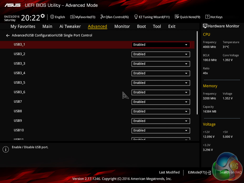 The level of granularity offered by the ASUS UEFI is impressive, especially since very little (if anything at all) has been cut out compared to higher-end Republic of Gamer's offerings. To illustrate this point, there's a section that lets you exercise individual USB port control, disabling USB ports you don't intend to use.