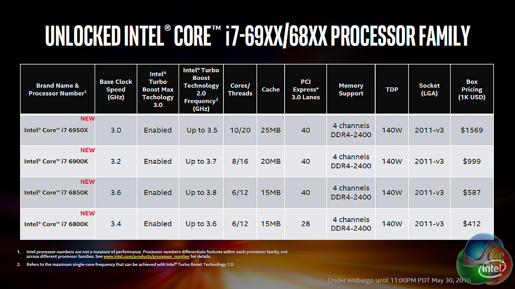 Next up is the Core i7 6900K which is the spec-sheet replacement for the i7 5960X as it boasts the same price point, $999, and the same octa-core design. The new part is the flagship Intel Core i7 6950X – a deca-core, fully unlocked and enthusiast-grade Broadwell-E part. An Intel Xeon-level price point of $1,569 is sure to make the i7 6950X significantly more exclusive than last generation's flagship i7 5960X.