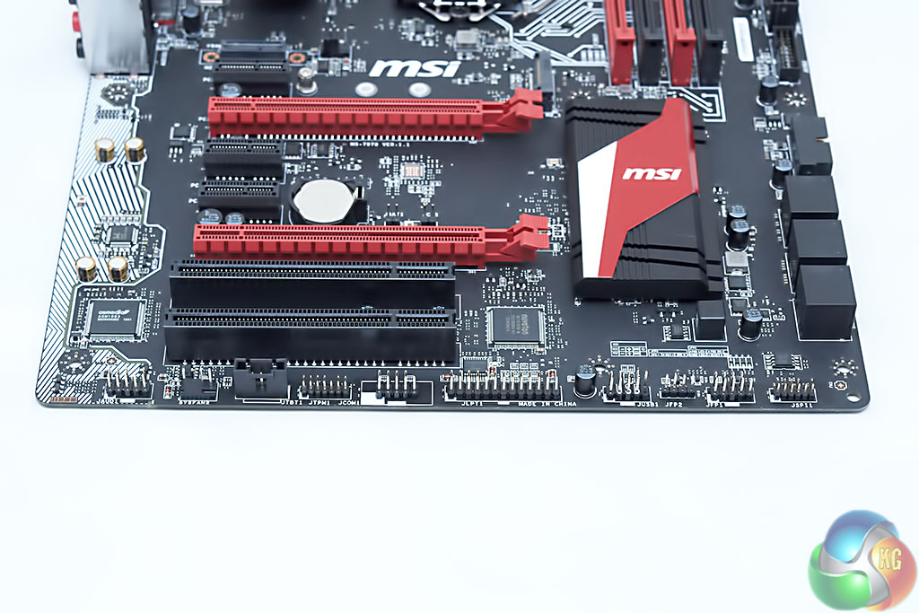 Around the CPU socket MSI implements an 8 phase VRM which is standard for the price point, we have no doubt this will be enough to push our Skylake CPU as far as it can go. MSI fits in two M.2 ports next to the CPU socket – the main one will support NVMe or SATA storage drives up to 2280. 22110 drives are not supported due to a PCIe 1X slot being in the way but for now 2280 includes all consumer M.2 drives including the Samsung 950 Pro.