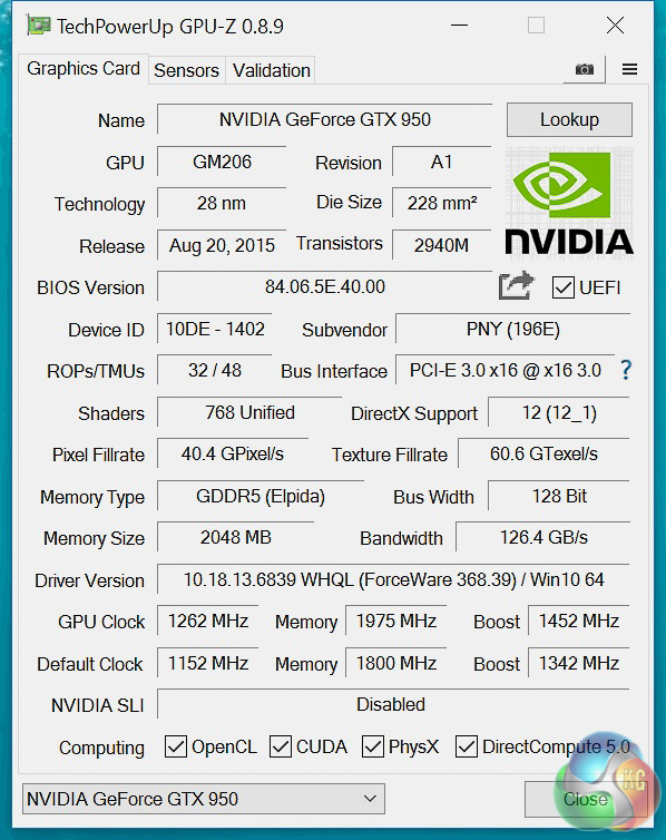 The aforementioned overclocks translated into an 8.3% boost in 3DMark performance for the PNY GTX 950 and a 9.1% boost for the GTX 960. In real terms there is very minimal overclocking headroom to be had, less than 10%, due to already high factory overclock