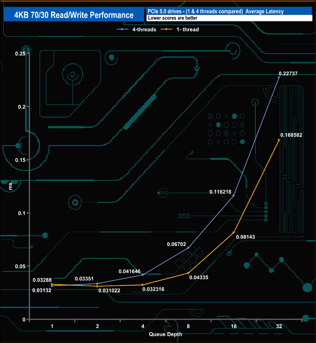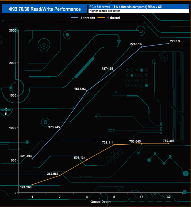 We used CrystalDiskMark 8’s custom settings to test the 4K 70/30 mixed read/write performance of the drive through a range of queue depths using a single thread and four threads.