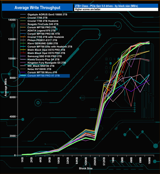 Its test result of 11,561MB/s may be a distance from the official maximum, but the 2TB Corsair MP700 Pro XT is the fastest member of the MP700 family we've seen, and sits just within the top ten drives on this list.
