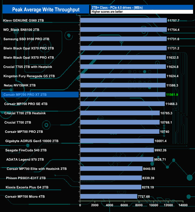 In the write throughput test, the drive produced a peak test result of 11,561.90MB/s (16MB block), some way off the official maximum of 14,500MB/s.