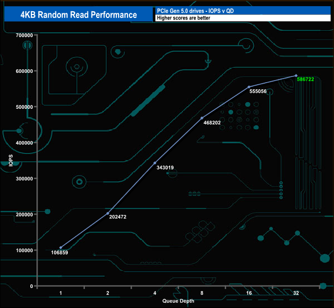 Using our four-threaded 4K random read tests, we couldn't get close to the official maximum of 2,700K IOPS. The best figure we saw was 586,722 IOPS (2,403MB/s), coming at the end of the test run at QD32.