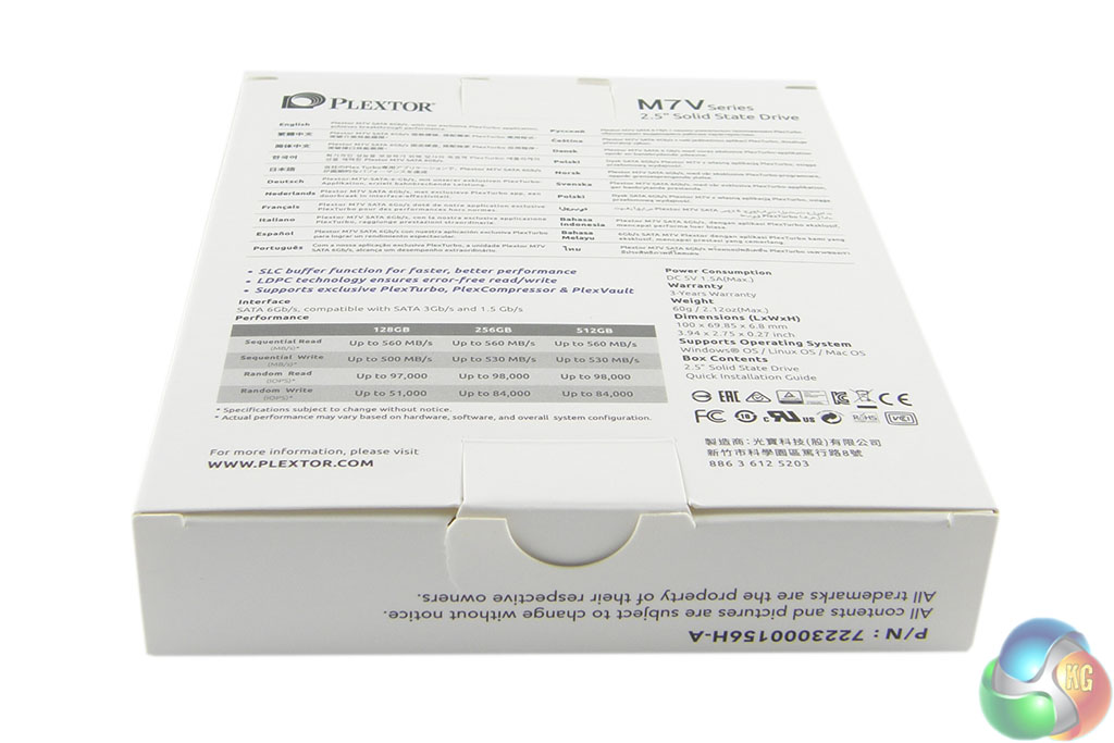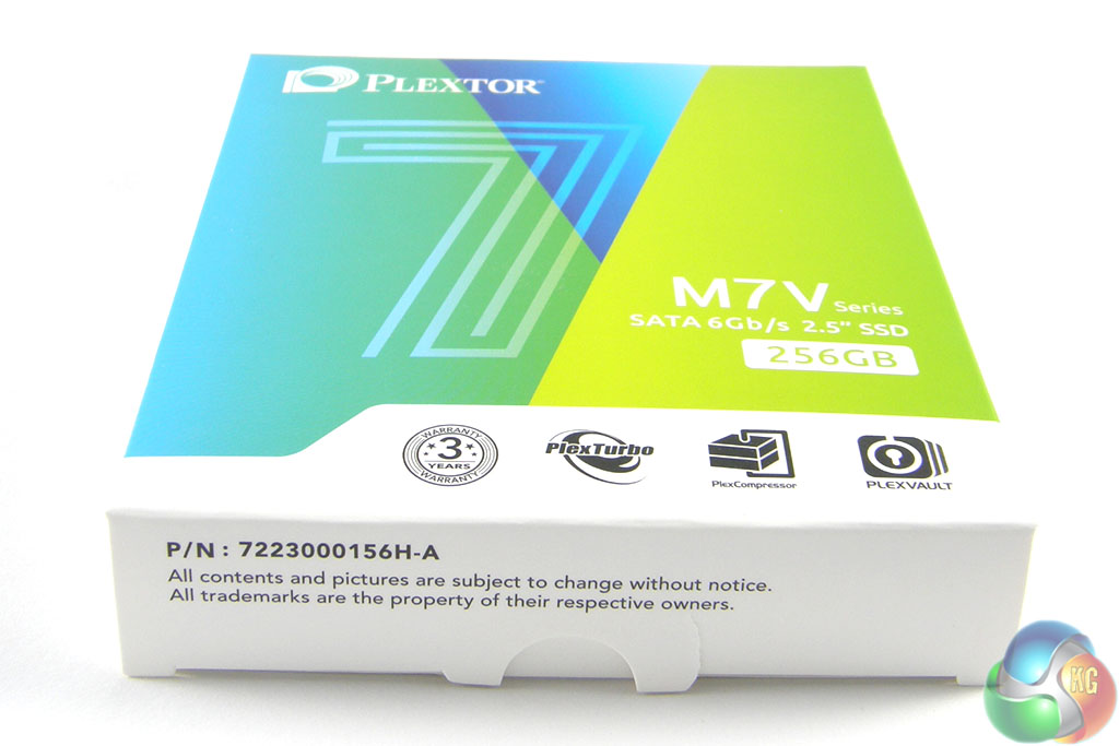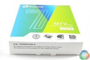 The front of the box displays the drives capacity, warranty information and the logos for three of the Plextor drive technologies the M7V supports. The rear of the box has a panel to display performance figures for the whole M7V range. It also carries a list of some of the drives specifications and the technologies it supports.