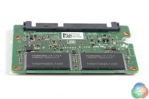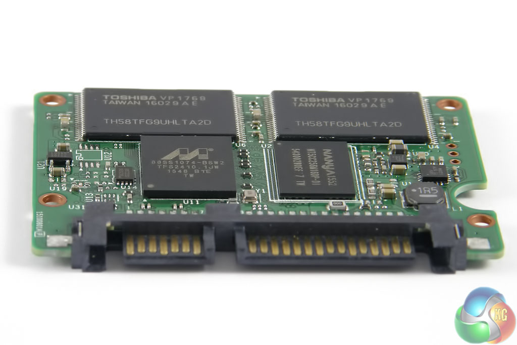 The PCB for the 256GB M7V is tiny, measuring just 40 x 52 mm. On one side are a pair of Toshiba second generation A19 15nm TLC Toggle NAND IC's (coded TH58TFG9UHLTA ) while on the other side of the board lurk two more Toshiba NAND IC's, the Marvell 88SS1074B1 8-channel controller and the 256MB Nanya DDR3L -1600 cache chip.