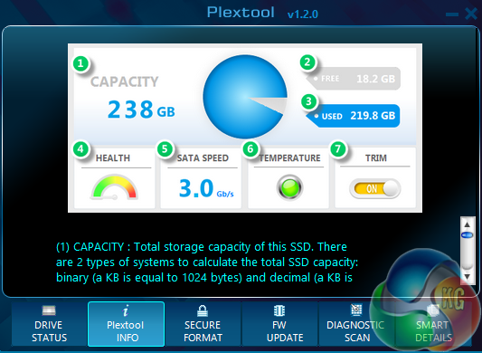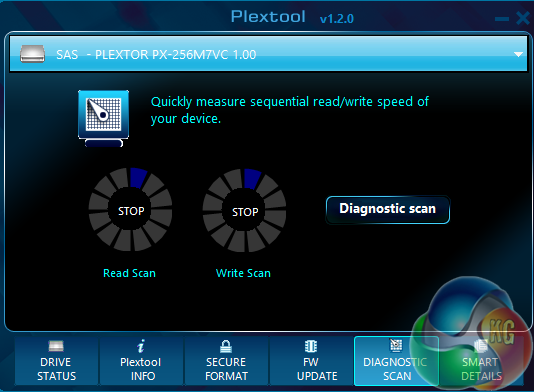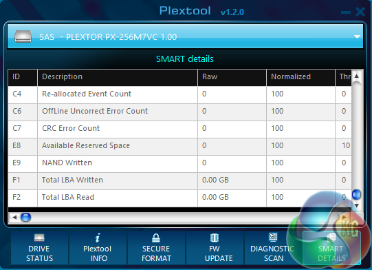Plextor's Plextool suite of drive utilities may not be all bells and whistles like some but what's provided are basically all you need to look after the drive. With it you can look at the drive's status and its temperature, usage etc. There's a secure format facility, a page to perform firmware updates, a diagnostic scan and finally S.M.A.R.T info.