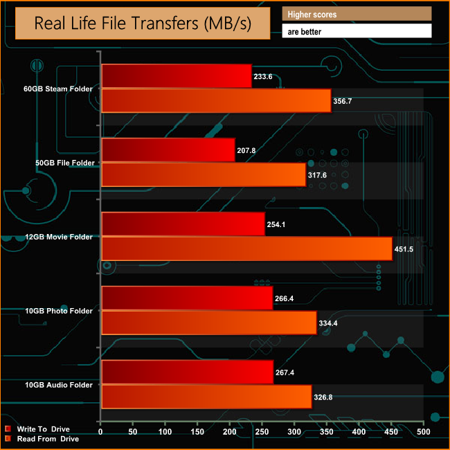 The M7V shows good consistency in the real life file transfer tests. It's particularly rapid at reading large files as can be seen by the 451MB/s figure for the 12GB Movie folder which consists of large video files. A 60GB Steam folder takes a shade under four minutes to write to the drive and two and a half minutes to read the data back.
