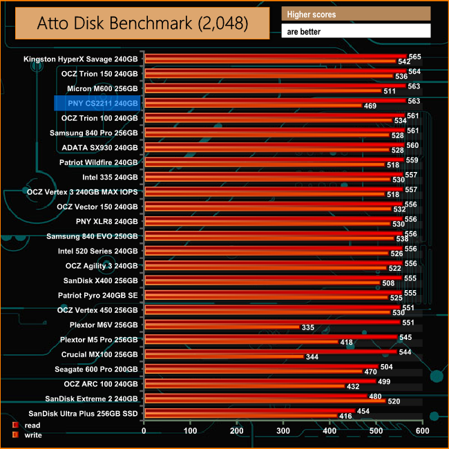 The CS2211 shows a very good turn of speed when it comes to sequential reads, keeping up with the fastest 240/256GB drives we've tested at 563MB/s. Write performance however isn't quite as strong at 469MB/s.