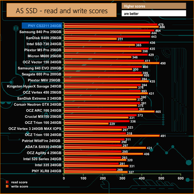 The CS2211 tops the AS-SSD scoring chart with very impressive scores for reads and writes. It performs strongly throughout the individual tests with the exception of the 4K read performance which is a little weak.