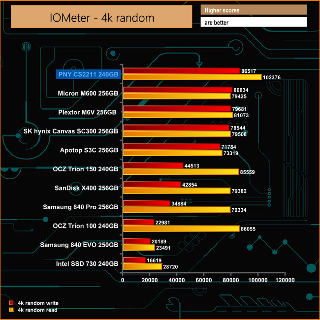 The CS2211 might have struggled a little in the deep depth 4K Q32 test of CrystalDiskMark but when it was tested with a much shallower queue depth of 1 it really flies. The write performance is good at 86517 IOPS, a little under the official figure of 87000 IOPS while the read performance is outstanding at 102376 IOPS making the official figure of 95000 IOPS look a tad conservative.