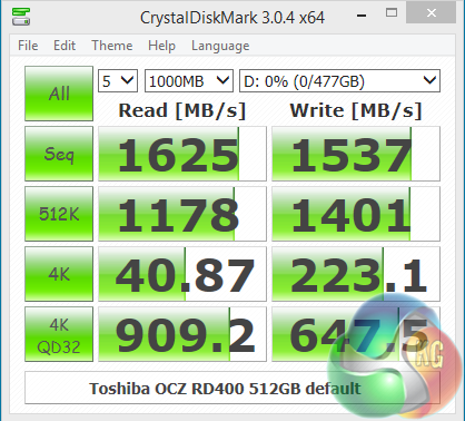 Apart from the extremely impressive sequential read/write speeds, the RD400 also handles deeper queue depths without any problems. At normal desktop queue depths the 4K random write 223.1MB/s is again very impressive but unfortunately the same can't be said for the read performance which is only on par with the faster standard 6Gb/s SATA SSD's.