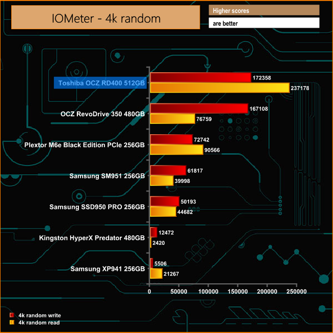 Toshiba OCZ quote random 4K read/write figures for the 512GB drive at up to 190,000 IOPS and 120,000 IOPS respectively but even these spectacular figures seem a more than a bit conservative as under test conditions the drive we have managed 172,358 IOPS for writes and a colossal 237,178 IOPS for reads. Simply stunning performance.