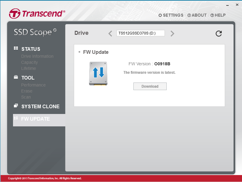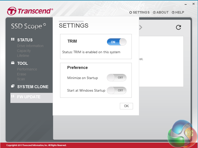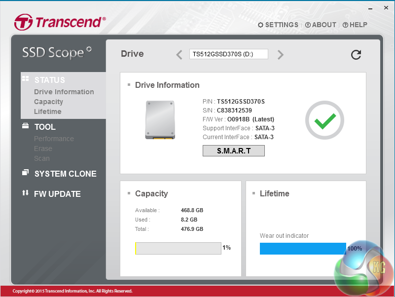 Transcend have their own SSD toolbox utility called SSD Scope which can be downloaded from the companies website. This is divided into four sections; Status shows drive information, S.M.A.R.T details, capacity (used and remaining) and drive life.