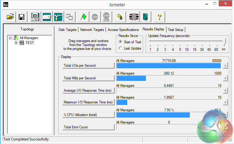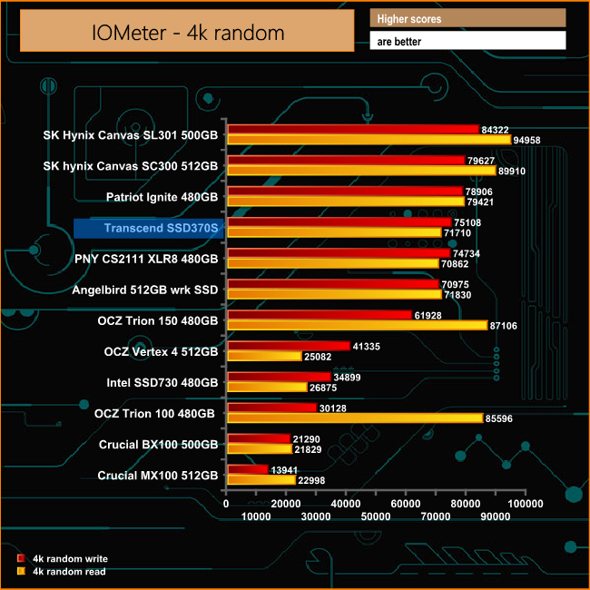 The impressive 4K write performance continues under the IOMeter benchmark, the drive producing a score of 75108 IOPS in the random read test, bang on the official number of 75000 IOPS. Once again the 4K read isn't quite as convincing producing 71710 IOPS, a little way off the official figure of 75K.
