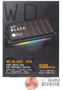 The WD Black P40 Game Drive comes in a sturdy box with an image of the drive on the front along with the regular WD Black branding. Under the right-hand side of the image, we see the drive’s capacity and read speed in both English and French.