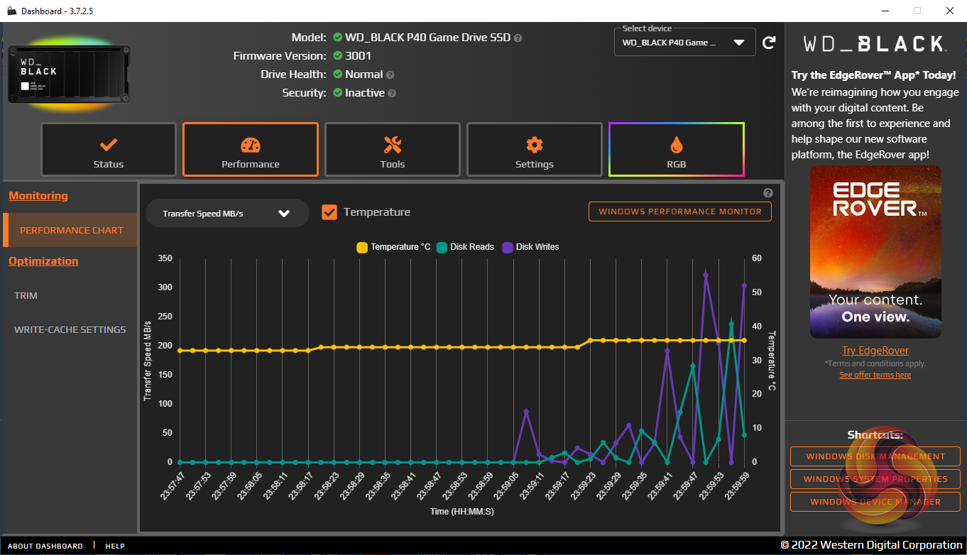 WD’s SSD Dashboard (v3.7.2.5 supports the Black P40 Game) is one of the best and about as comprehensive an SSD management utility as you’ll likely to find. It displays information on drive temperature, life remaining and a whole lot more including a live performance monitor. There isn’t any cloning utility incorporated into the dashboard but Acronis True Image WD Edition which can download from WD’s website.