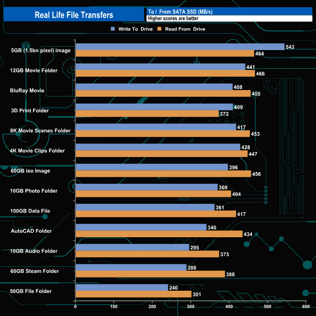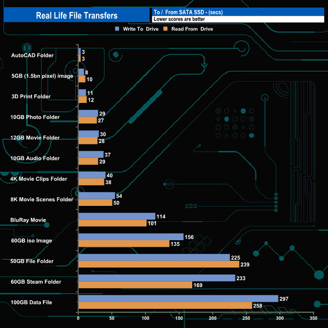 To test the real-life performance of a drive we use a mix of folder/file types and by using the FastCopy utility (which gives a time as well as MB/s result) we record the performance of drive reading from & writing to a 256GB Samsung SSD850 PRO.