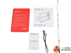The Creative Sound BlasterX AE-5 ships in a black box with plenty of colourful accents spread across the front. A photo of the sound card itself is also splashed across the front of the box.