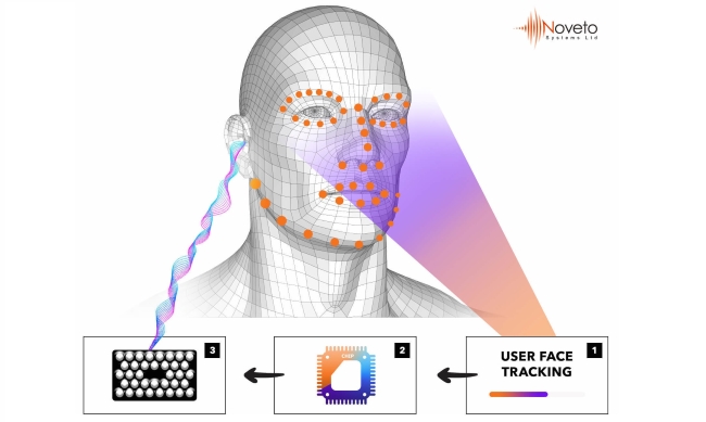 Noveto Smart Audio uses a proprietary smart algorithm with a sophisticated beamforming technology, face detection, tracking capabilities and a DSP engine to locate the position of users ears and then beams acoustic energy to create “sound bubbles” right next to the ears. When the users head moves, the sounds bubbles dynamically adjust to follow the user. Noveto controls the acoustic waves generated by its device with a dedicated chipset which handles numerous audio channels to create full-range stereo, surround and 3D sound.