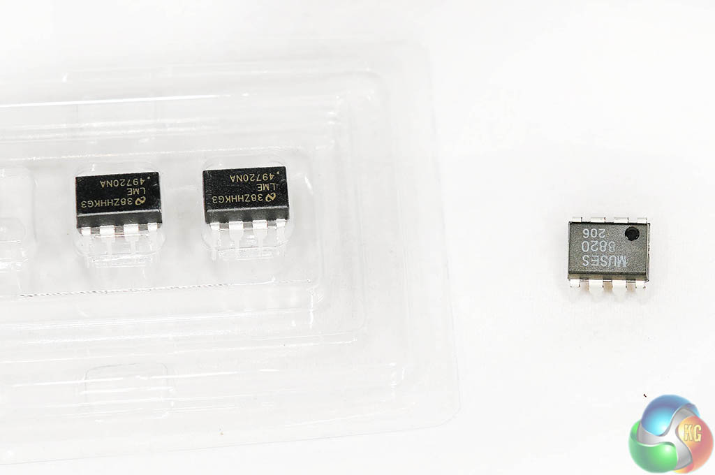 The main Essence STX II card has removable OP-AMPS, shown above. In the box are a set of other OP-AMPS which can be fitted to change the sound signature. ASUS include 2 x LME 49720 and a single MUSES 8820 OP AMP. Asus fit the MUSES 8920 OP AMP's as standard (above left) – a wise move, as (to my ears) they sound superior to the LME OP AMPS (above right).