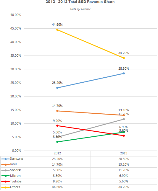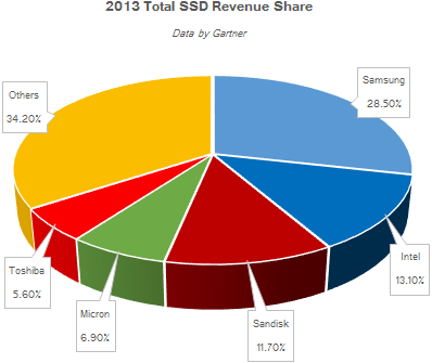 The SSD market soared to $10.9 billion (£6.3533 billion, €8.0192 billion) in 2013, despite NAND flash chip shortages and stable prices, according to Gartner. Top five SSD makers controlled 65.8 per cent of the market's revenue in 2013, up from 55.4 per cent in 2012. All leading suppliers of solid-state drives had their own NAND flash manufacturing capacities (or co-owned them), which underlines importance of fabs for the flash storage market going forward.
