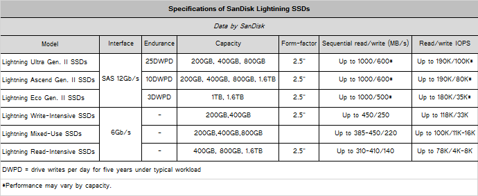 SanDisk Lightning II family of solid-state drives is based on single-level cell (SLC) NAND flash memory produced using 19nm process technology, which is one of the most reliable types of flash memory available today. The drives utilise proprietary controllers and firmware and are available in different capacities from 200GB to 1.6TB. The SSDs provide up to 1000MB/s read speed, up to 600MB/s write speed and can perform up to 190 000 input/output operations per second (IOPS).