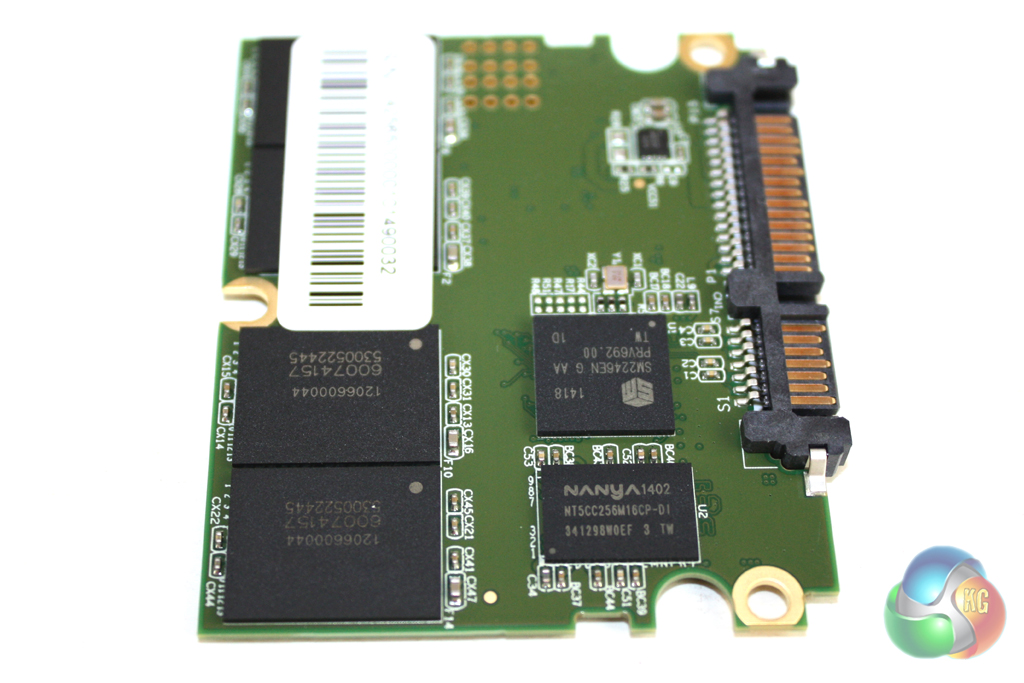 We can see that there are four 64 GB memory chips on either side of the PCB which are IMFT (Intel) 60074157 20nm MLC NAND. We find the SMI SM2246EN controller and 256 MB (DDR3) Nanya NT5CC256M16CP-D1 cache chip on the underside of the PCB.